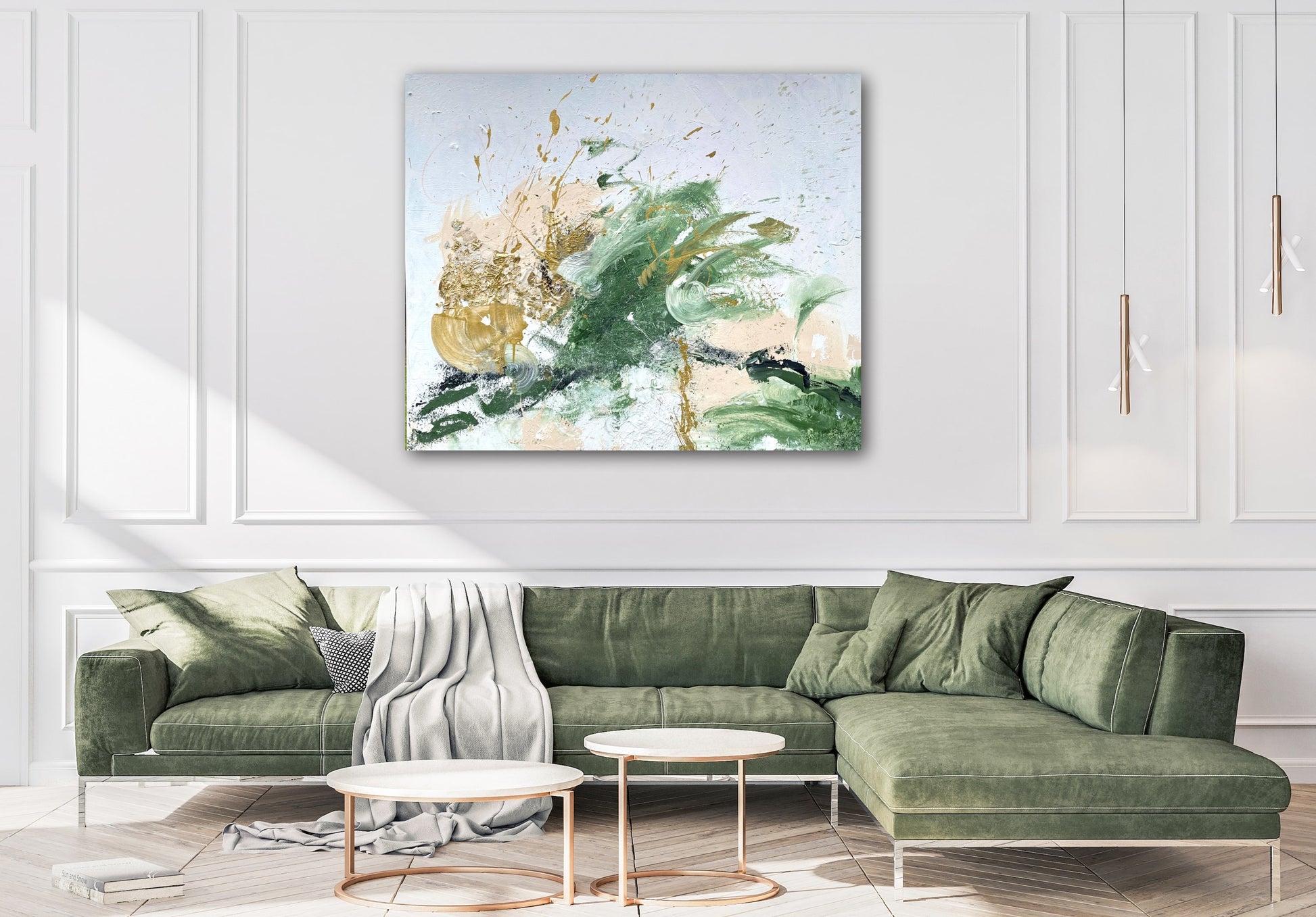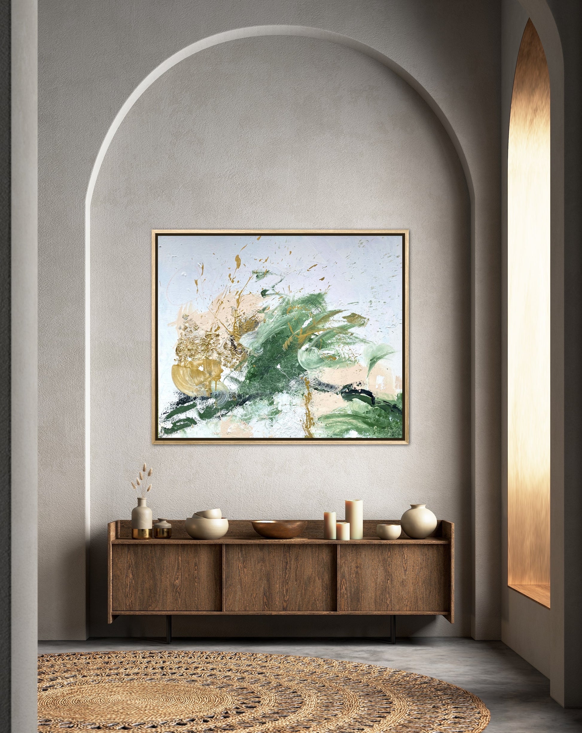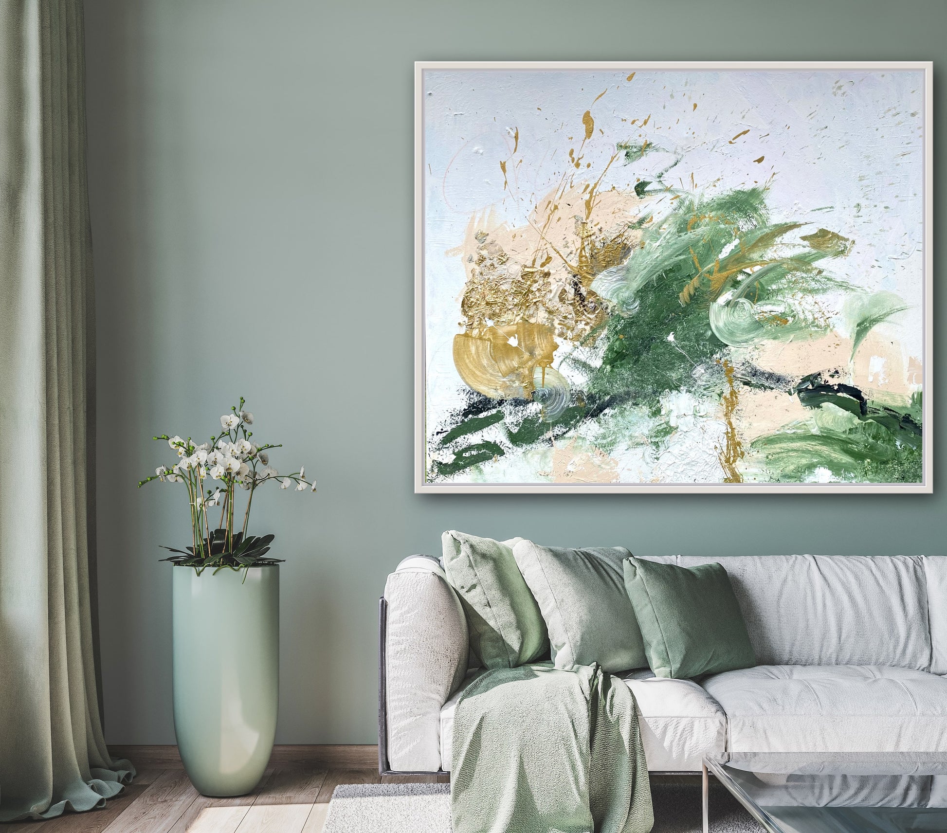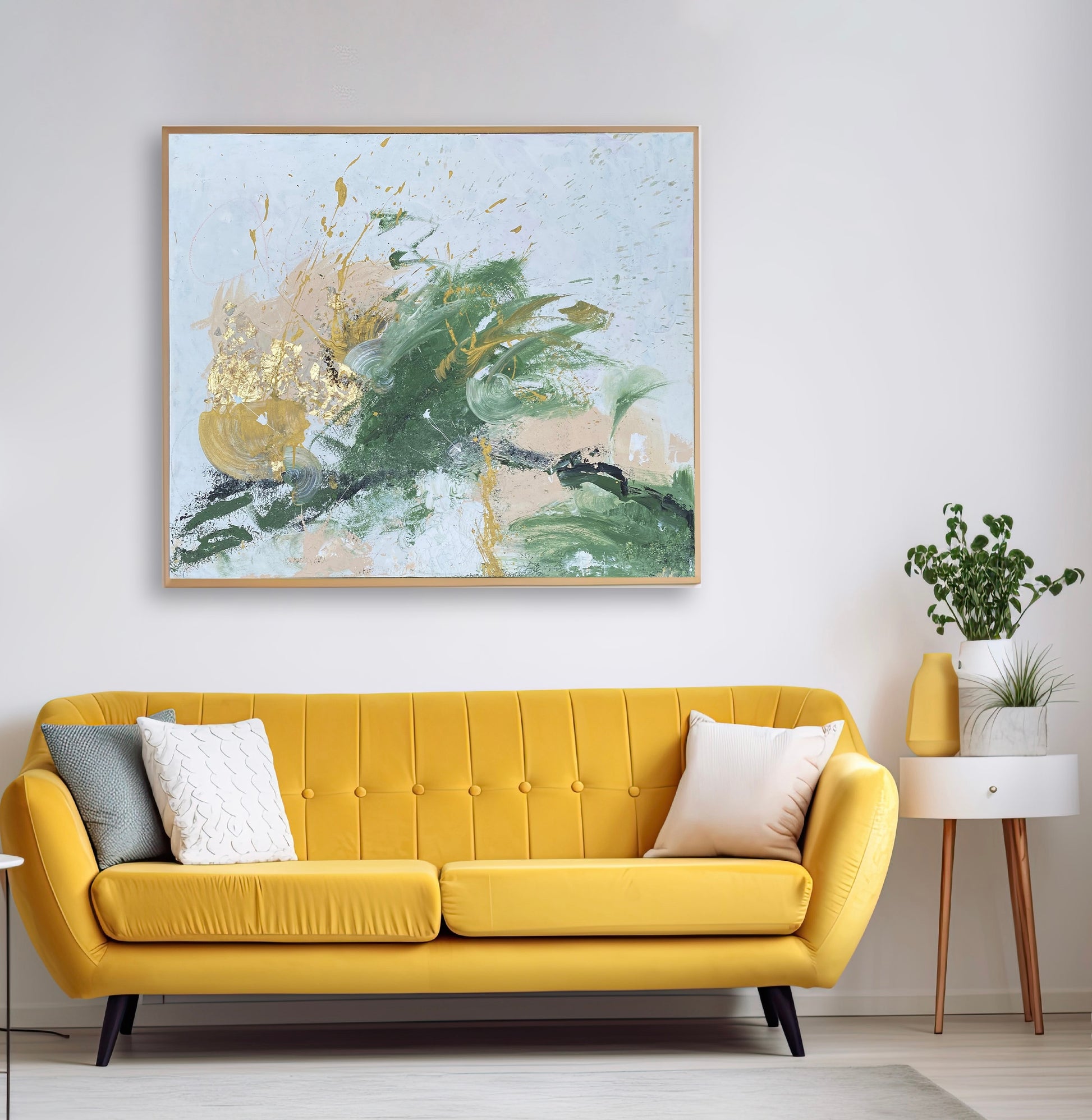 Das Kunstwerk präsentiert eine Leinwand, auf der ein stürmischer Himmel in verschiedenen Grüntönen mit goldenen Akzenten dargestellt ist. Das Grün steht symbolisch für das Wachstum, die Hoffnung und das Potenzial, das trotz der Dunkelheit und des Schmerzes vorhanden ist. Die Pinselstriche sind wild und ungestüm, um die emotionale Intensität und die Unvorhersehbarkeit psychischer Erkrankungen widerzuspiegeln.